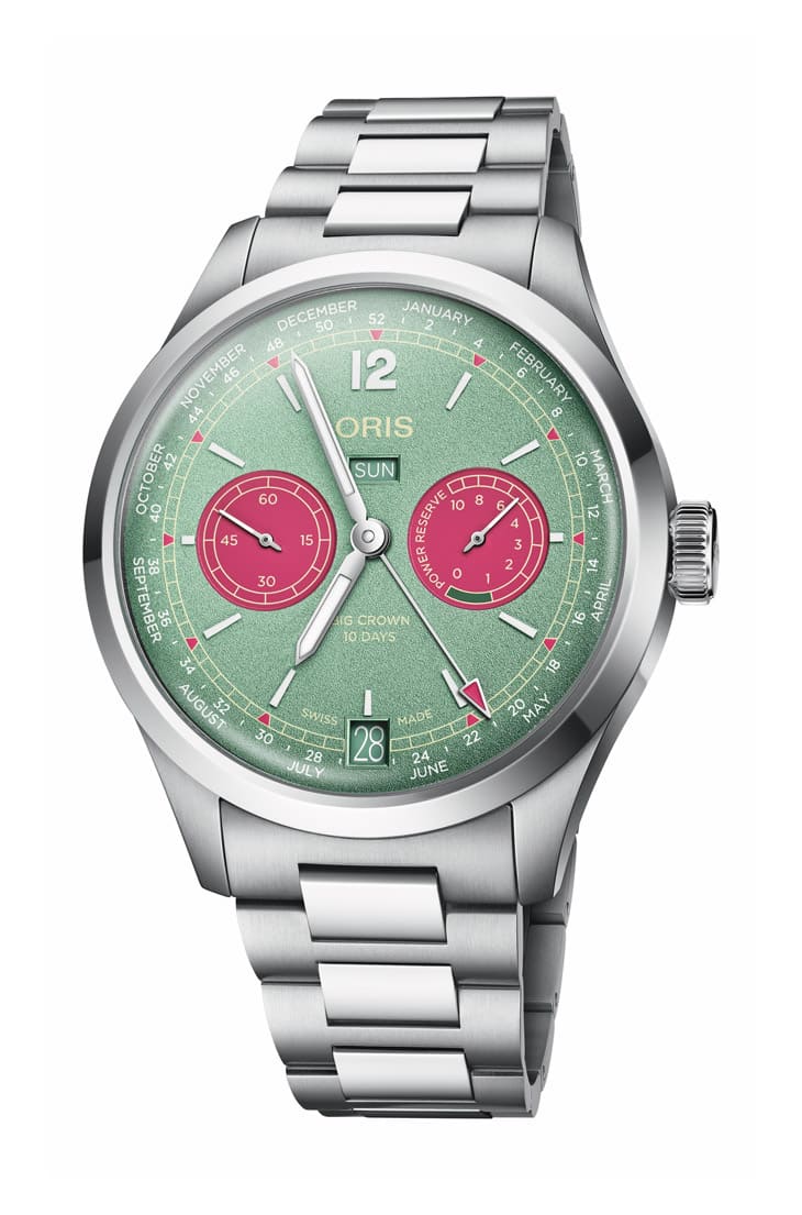 手錶採用43mm不鏽鋼錶殼,搭配圓弧形藍寶石水晶鏡面與50米防水性能。面盤色彩鮮明而且是這次的亮點,其以薄荷綠為主,配合玫瑰粉色小錶盤,指針與時標塗覆Super-LumiNova夜光塗層,光線不足時仍能清晰閱讀。面盤外緣設有52週的日曆環,由中央粉色尖端指針指示,星期和日期視窗分別位於12點與6點鐘,小秒針置於9點,非線性動力儲存指示則在3點鐘方向,手錶配置不鏽鋼鍊帶,表面經拋光與拉絲交錯,佩戴舒適且耐看。