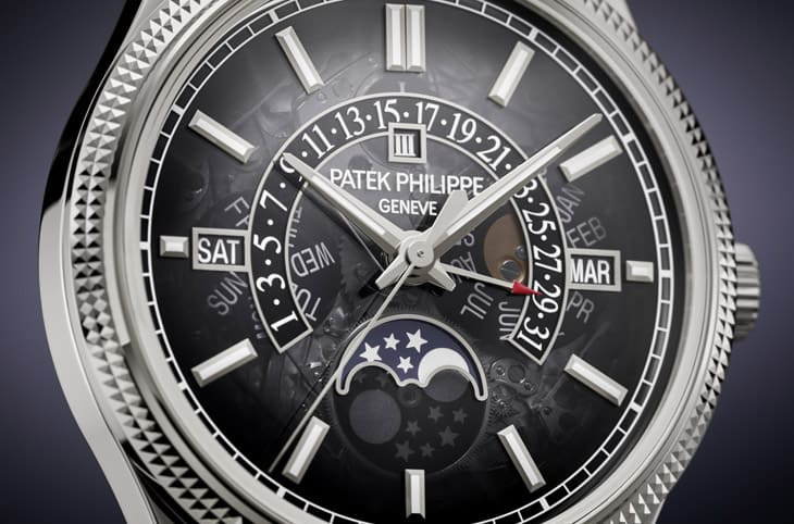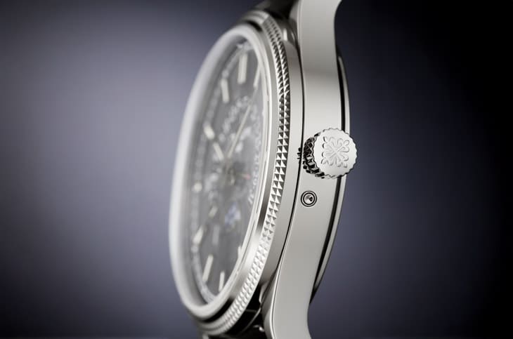 ▲白金錶殼搭配巴黎釘紋飾紋,烘托整體的優雅比例,透過這種細緻機刻紋理提升層次,結合拋光處理營造典雅氣息,充分展現百達翡麗對工藝與細節的堅持。