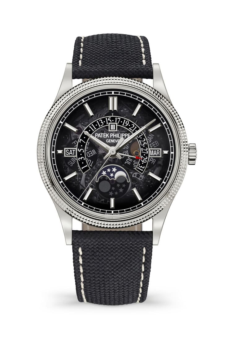 6159G最容易吸引目光的莫過於那片煙燻藍寶石面盤,它的半透明質感像是打開了一扇小窗,讓人得以窺見機芯的律動,但又不至於完全赤裸裸地暴露所有細節,邊緣自灰藍色逐漸過渡到黑色,形成漸變的深邃感,這種處理方式不僅讓面盤更具立體感,也營造出一種神祕氛圍。不同於朗格的Lumen系列直接大方展示整體結構,百達翡麗的處理手法更收斂,讓人感受到機械的複雜度,又保留了含蓄與格調,時針、分針與時標上均塗有夜光塗層,即使在昏暗光線下,讀時依然清晰。加上星期、月份、閏年與月相的顯示窗,細節被白金邊框圈起,讓面盤更顯立體與精緻,對於收藏家而言,這樣的「X光美學」不僅可以提升辨識度,也象徵品牌願意用創新的思維去詮釋經典複雜功能。