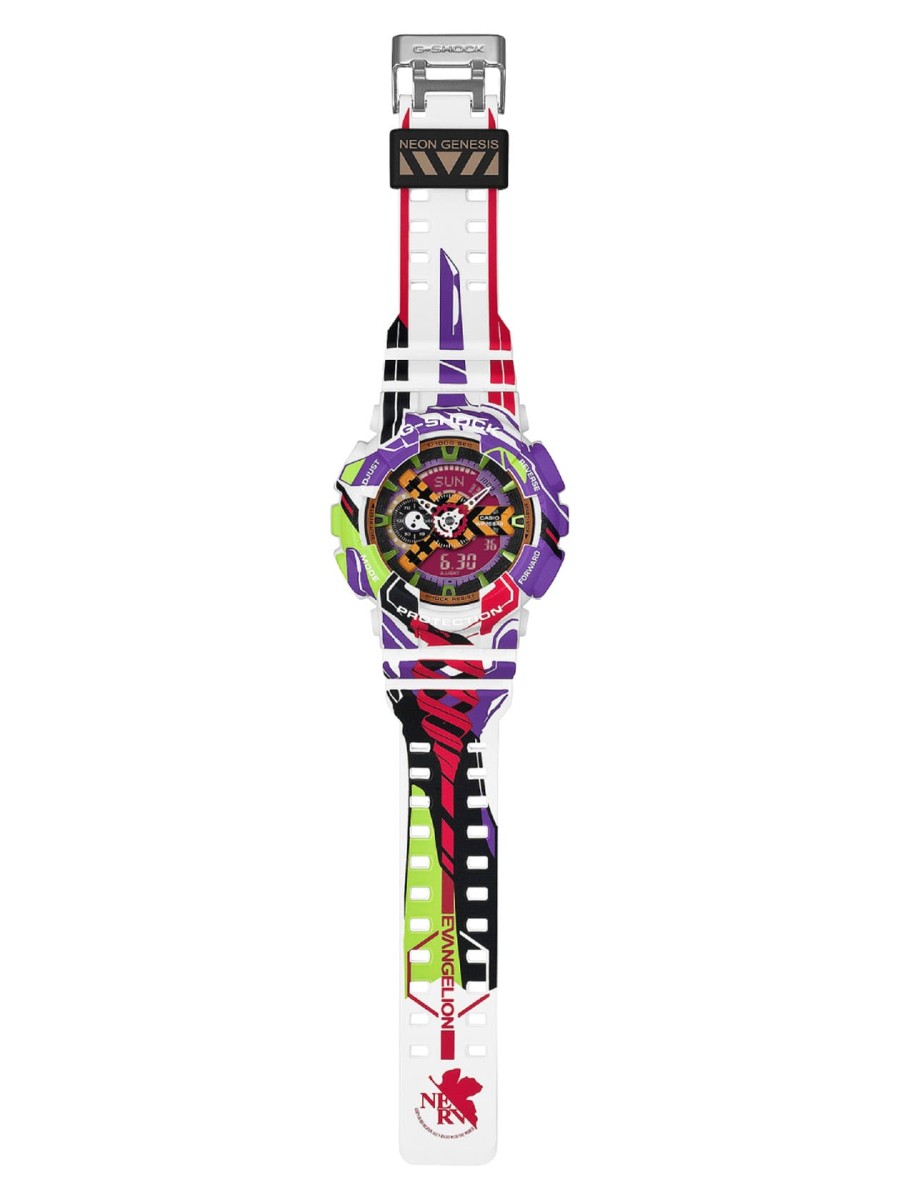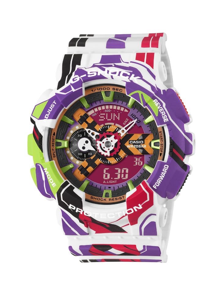 這款錶以GA-110系列大錶殼為基礎,尺寸55×51.2×16.9mm,重量72克,厚實的外型帶有G-SHOCK一貫的運動感,白色底色象徵初號機的純淨與力量,與紫色、螢光綠細節形成鮮明對比,錶殼、錶圈與錶帶均採用樹脂材質,不僅輕盈耐用,也為手錶提供高度防護。