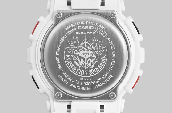 GA-110EVA30-7A完整承襲G-SHOCK特色,包括耐衝擊結構與JIS 1級抗磁設計,並具200米防水,同時配備世界時間、秒錶、計時器、鬧鈴、全自動日曆、12/24小時制顯示,以及琥珀色LED照明,電池壽命約兩年,背蓋刻有福音戰士30週年紀念徽章,搭配專屬收藏盒,更突顯其紀念價值。