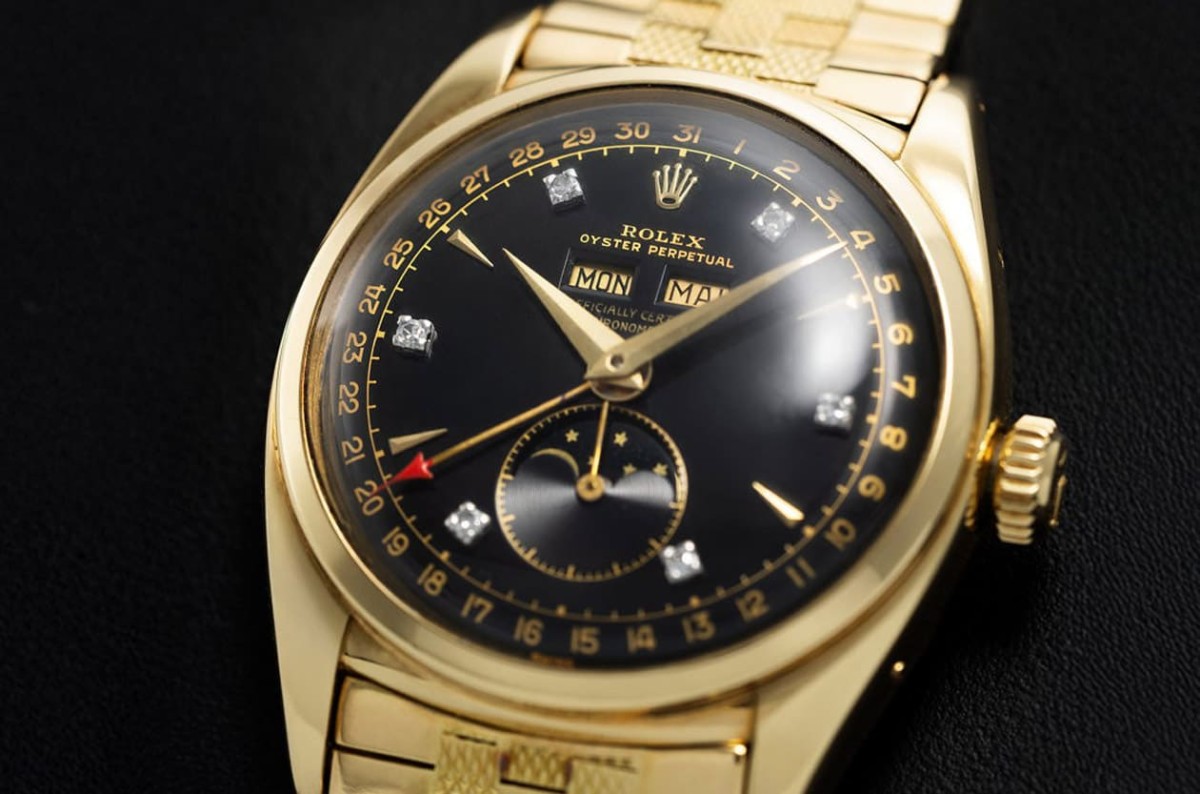 若要理解這場轟動的源頭,得回到上世紀五○年代。那時,勞力士曾推出過少數幾款全日曆錶,其中最著名的,莫過於Ref. 8171 "Padellone",收藏家暱稱它為「平底鍋」,因為38mm的錶殼在當年已屬大型規格。這些古董全日曆錶不僅擁有日、月與日期顯示,還搭載月相視窗與指針式日期結構,風格典雅、比例均衡,如今在拍賣市場上價值連城。例如一只金質Ref. 6062最近在拍賣會上便以620萬美金高價成交,躋升為史上第三貴的勞力士。