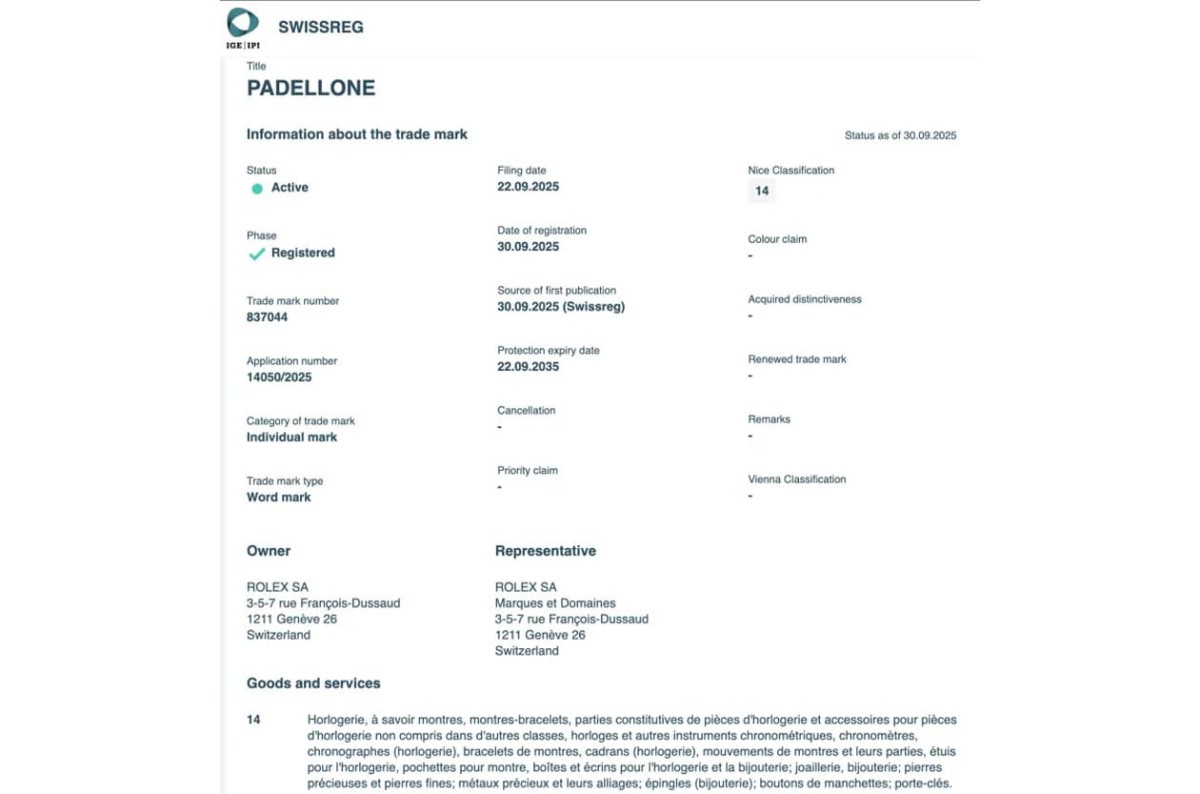 ▲勞力士已於9月為"Padellone"註冊了商標。Source:Swissreg.ch