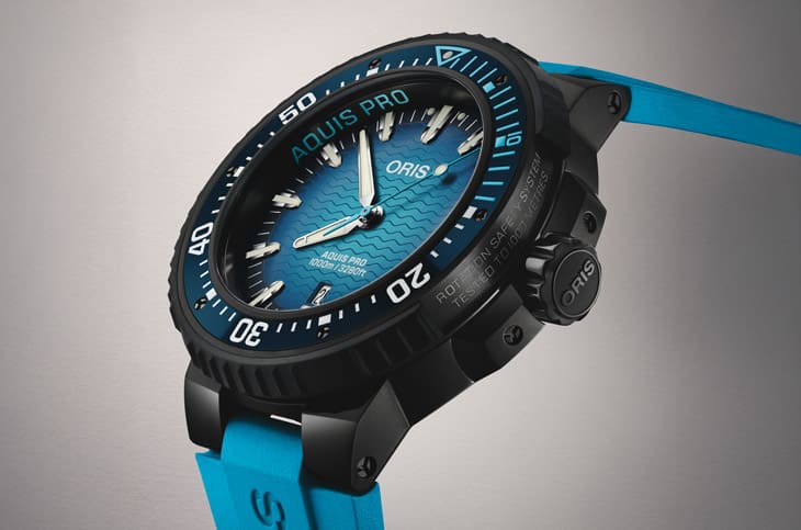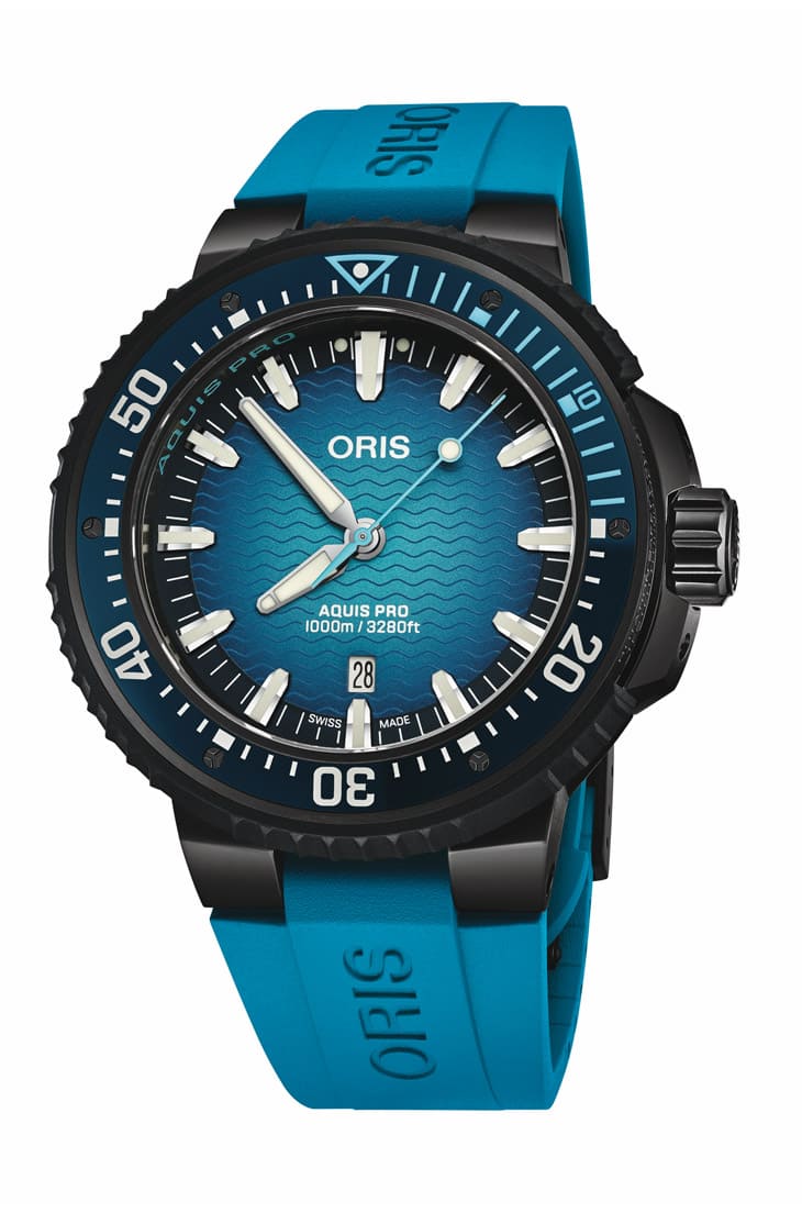 鈦合金錶殼以深色PVD處理,堅固又輕盈;藍色漸層面盤流動著如水般的光澤,搭配藍色陶瓷刻度圈,既實用又充滿視覺張力,Super-LumiNova®夜光讓指針與時標在水中依舊明亮,內部搭載733自動機芯,提供穩定動力與日期功能。更貼心的是,品牌會隨錶附上藍、黑兩條橡膠錶帶,並配有可調式安全折疊扣,讓潛水員能隨時調整鬆緊度,這是一只設計與功能平衡的潛水錶,也是ORIS對專業精神的最佳詮釋。