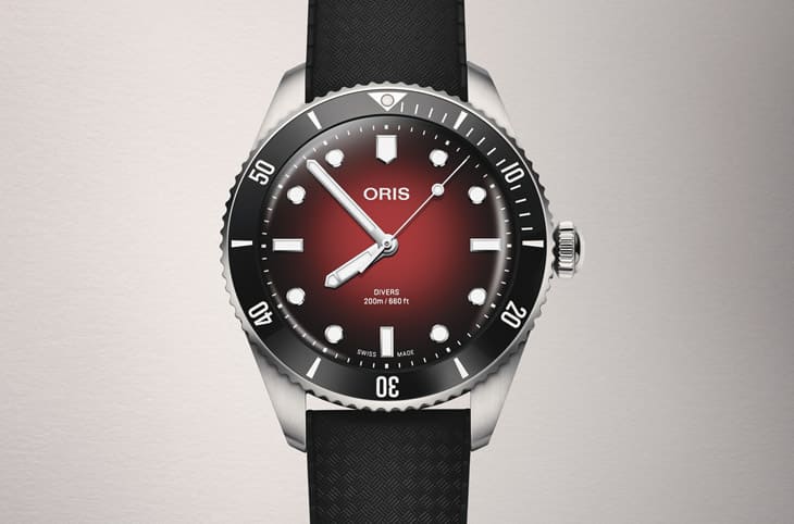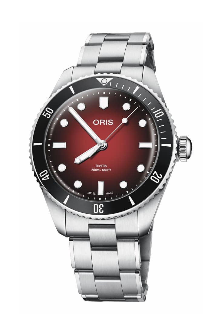ORIS與全球鐘錶收藏社群RedBar的合作再度開花結果,這款限量250只的潛水錶,是對熱情與友情的致敬。39mm不鏽鋼錶殼搭配單向旋轉陶瓷錶圈,保持實用與復古兼具的比例,最吸睛的莫過於那枚紅黑漸層面盤,由中央亮紅逐漸轉為深黑,象徵RedBar社群的凝聚力與熱血,指針與刻度皆覆上Super-LumiNova®夜光塗層,夜間視讀依然清晰。