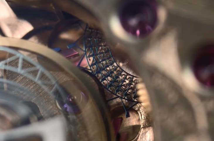 真正讓7225成為技術代表作的,是它搭載的74SC手上鍊機芯,這枚機芯以361枚零件構成,卻蘊藏兩項革命性創新。第一是磁力轉軸擺輪(Magnetic Pivot),利用兩端微型磁鐵產生的磁場,使擺輪軸懸浮並自動歸中,幾乎消除零件摩擦機會,確保長期穩定的走時精度。這個機構的動態平衡效果,堪比昔日陀飛輪的補償功能,卻以更輕巧的方式實現。第二項突破是10Hz超高震頻,換算下來每小時達72,000次震動,走時誤差控制在每日±1秒之內,堪稱機械錶的極致精準境界。