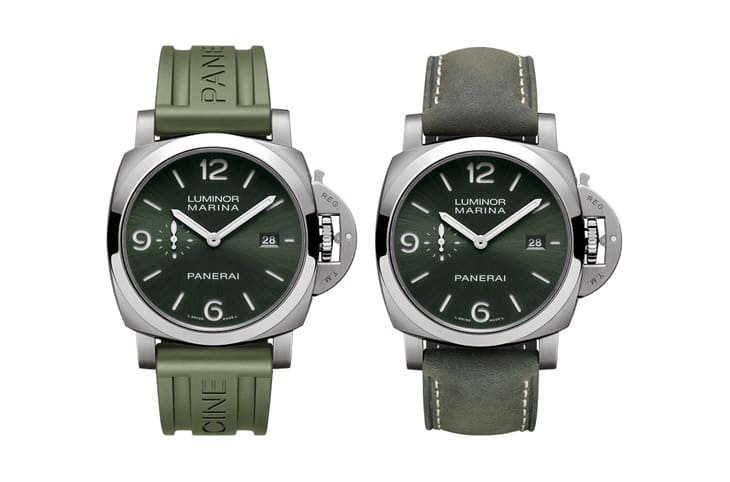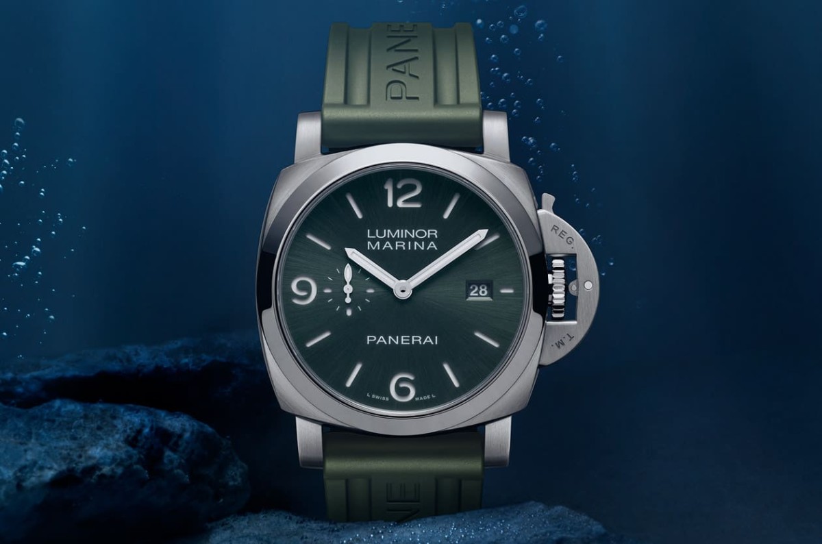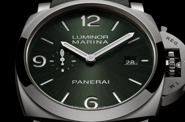 沛納海這次選擇了一抹深邃又內斂的「軍綠色」,帶著一點橄欖灰調的光澤,經太陽放射紋打磨後,隨角度不同而展現柔和漸層,這是一種沉穩、有歷練的色彩,就像深海潛行後的寂靜時刻,延續品牌經典的「三明治面盤」結構,上層為鏤空的數字與刻度,下層則覆有夜光塗層,這層Super-LumiNova® X2夜光塗層比前代更亮、更持久,讓人在昏暗環境中依舊能清楚讀時,9點鐘方向的小秒盤維持Luminor Marina家族慣用配置,小秒針同樣具夜光效果,與主指針呼應。3點鐘的日期窗採用斜切邊框設計,並細心地將日期盤顏色調成相同綠色,整體融合度極高。品牌Logo與Luminor Marina字樣被刻意保持簡潔,沒有多餘裝飾,這種留白讓面盤的綠光更有呼吸感,這是一種低調的力量,不張揚卻足以讓懂的人一眼識出。
