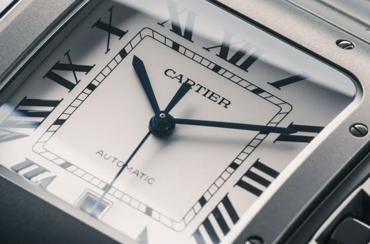 錶款的銀白色放射紋面盤與霧面鈦殼的對比恰到好處,既不張揚,又充滿視覺層次,放射狀排列的羅馬數字時標是品牌的經典符號,黑色印字在亮面底色上格外清晰,中央搭配藍鋼劍形指針,帶出一絲卡地亞特有的法式優雅。品牌在VII的數字中藏入了微小的CARTIER字樣,這項隱藏簽名不只是趣味細節,更是一種專屬於內行人的暗示,面盤外圍的軌道式分鐘刻度延續歷史風格,搭配6點鐘位置的日期窗,實用又不搶戲。配色雖然保守,但質感卻相當講究,銀白面盤的細膩紋理呼應錶殼的霧面處理,讓視覺更為協調,若說鋼款Santos偏向都會優雅,那鈦金屬版則更像一位內斂的飛行工程師,擁有理性、準確、沉著的個性,它讓人重新理解「低調奢華」這四個字的真正含義