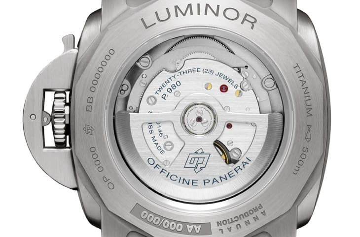 錶殼透明底蓋之下,運作的是P.980自動機芯,這枚機芯不僅更纖薄、更穩定,也展現品牌自製能力的成熟演進。P.980震頻達4Hz,動力儲存為三天,足以大大滿足日常佩戴的節奏。它採用橫跨式擺輪橋板結構,能有效提升抗震性與穩定度,同時也具備掣停秒針裝置,也就是拉出錶冠時秒針立即停止,方便精準校時。每枚P.980機芯出廠前都經過六個方位測試,確保在任何佩戴角度下都能維持穩定走時。透背設計可以清楚看到那種「沛納海式的工業美」,機芯表面以拉絲處理呈現結構層次,並點綴著藍色雕刻文字,P.980機芯就像是一顆被訓練過的心臟,準確、強壯、耐用;沒有花俏修飾,但絕對能陪你走得遠。
