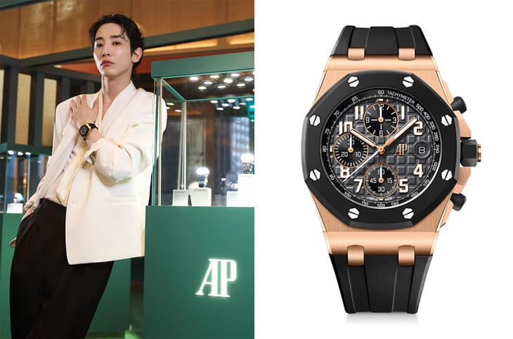 在眾多嘉賓中,李洙赫與蕭敬騰成為全場焦點。韓星李洙赫佩戴的Royal Oak Offshore自動上鍊計時碼錶,以18K玫瑰金錶殼搭配黑色橡膠零件,溫潤金色與冷峻黑色交錯出強烈對比。面盤採用愛彼招牌的Méga Tapisserie超大型格紋,厚實中帶有精緻感,展現運動與雅緻並存的氣場。