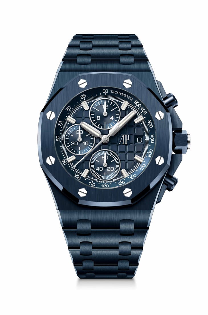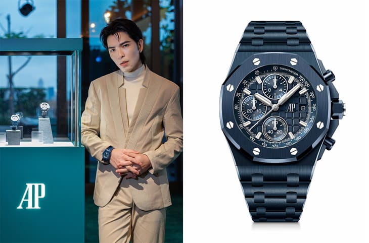 蕭敬騰則選擇展現「單色美學」的Royal Oak Offshore自動上鍊計時碼錶(42mm),其以陶瓷材質打造雲夜藍色調的錶殼與錶鍊,細節處透過亮面拋光與霧面打磨交錯,呈現光影流動的層次感,藍白對比的指示與刻度設計,不僅視覺鮮明,也體現愛彼在功能與設計間的完美平衡。