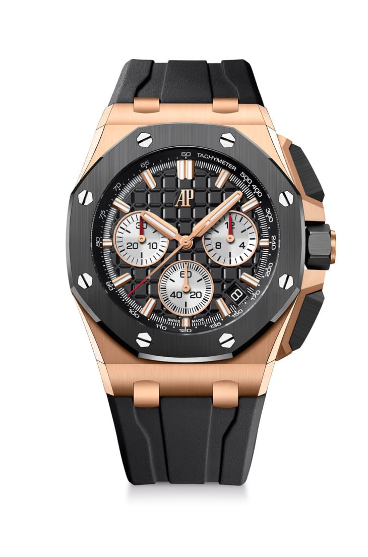 ■Royal Oak Offshore皇家橡樹離岸型自動上鍊計時碼錶,玫瑰金、陶瓷材質,錶徑43mm,參考價:NT$ 2,106,000
