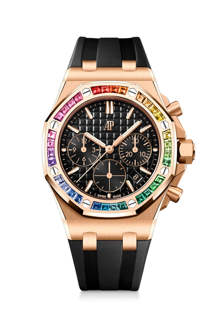 ■Royal Oak Offshore皇家橡樹離岸型自動上鍊計時碼錶,玫瑰金材質,錶圈鑲方形切割彩虹色寶石32顆,錶徑37mm,參考價:NT$ 3,874,000