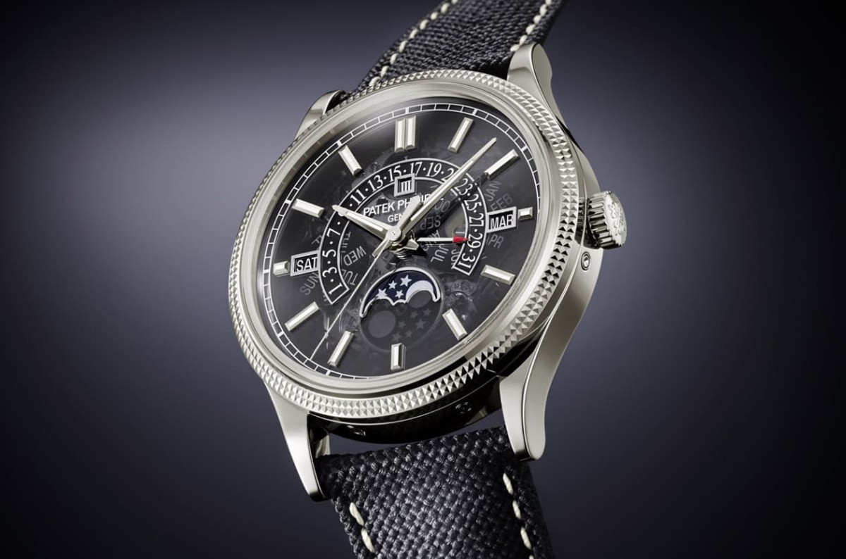 在專館的眾多藏品中,Henry精選出三款極具代表性的百達翡麗作品,分別展現品牌在工藝突破、功能整合與經典美學上的三個面向。首先是Grand Complications 6159G逆跳萬年曆,這款腕錶延續品牌自1937年的逆跳萬年曆傳統,並以現代角度重新詮釋,半透明的煙燻藍寶石面盤營造出深邃神祕的效果,讓人同時感受到機械運轉的躍動與工藝的含蓄優雅,白金錶殼上的巴黎釘紋以傳統手工雕刻而成,體現「傳承與創新並行」的哲學。