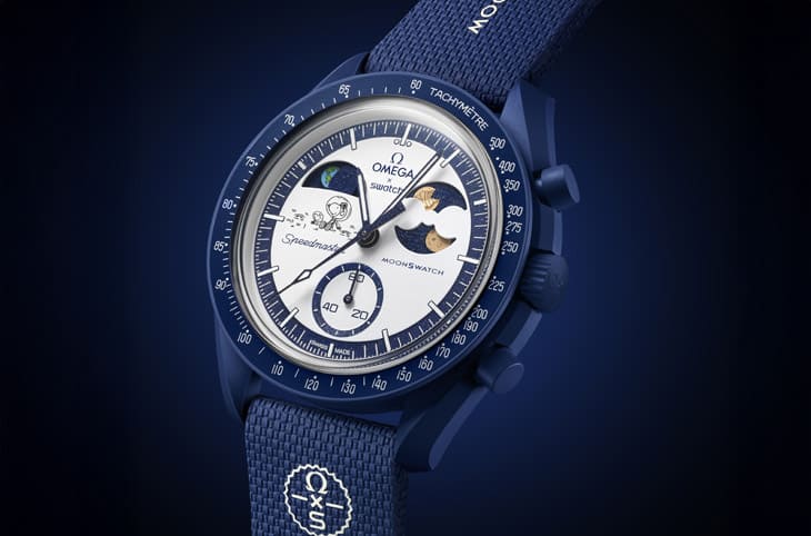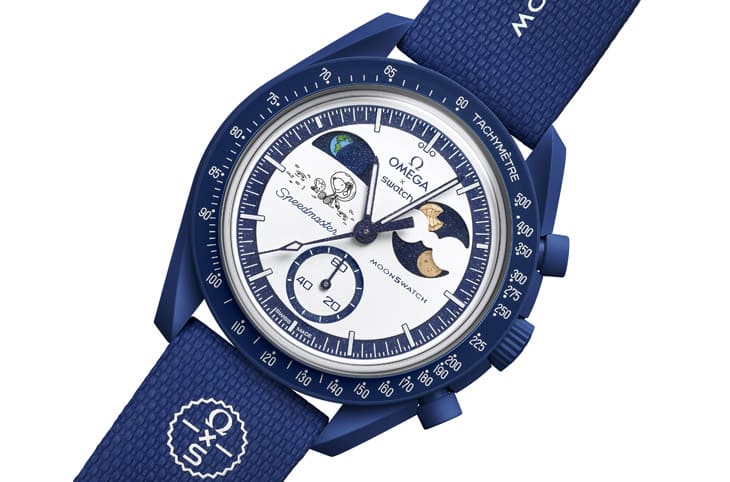 除了月相盤,「海狸月」也保留了自2024年首見的「地相顯示」功能,10點鐘方向的小盤以反轉視角呈現地球的盈虧變化,讓人從「月球的眼中」看見地球的光影變化,它的週期同樣是29.5天,但旋轉方向相反,象徵人類與宇宙之間的雙向凝望,每當用紫外光照射時,地球水域部分會透出藍色光澤,下方還藏有史努比與糊塗塔克仰望地球的小插圖,這樣的隱藏細節,讓MoonSwatch的浪漫不止於表面。