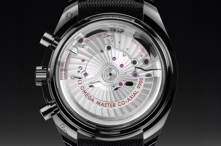 手錶搭載的9900機芯可說是目前歐米茄最成熟的計時平台之一,相較於之前上一代的9300機芯,9900的最大升級在於通過了METAS大師天文台認證,代表它能抵抗高達15,000高斯的磁場,同時在精準度與穩定性上達到高水準,這枚導柱輪計時機芯震頻為4Hz,擁有雙發條盒、60小時動力儲存,而且設計上更便於維修與長期穩定運作。值得一提的是,它具備獨立可調校時針功能,讓佩戴者在跨時區時能單獨調整時針而不影響走時或計時,實用性極高。透明底蓋下方可見機芯表面有阿拉伯式日內瓦波紋裝飾,金屬零件的切面光澤與放射紋理交錯成視覺饗宴,每個螺絲、每條邊緣都經精細倒角拋光,看得出歐米茄在「工業精密」與「工藝美感」之間找到平衡。