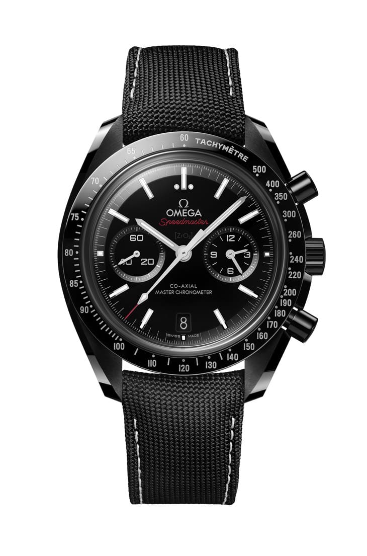 拿近一看,這只錶的面盤比照片更有戲,歐米茄採用黑色陶瓷「階梯式」面盤,也就是中央略微隆起、外緣下斜,重現早期歐米茄經典手錶的設計,它不只復古,也讓光影層次更加明確,黑色在不同角度下呈現出深淺變化,有時如絲絨般柔軟,有時又如黑曜石般銳利。面盤結構為雙層陶瓷,經雷射精密雕刻出細緻刷紋,比傳統金屬面盤更能折射光線,佈局上維持雙眼配置:左側小秒針,右側是整合了計時與計分的小錶盤,讓面盤看起來更平衡也更俐落,6點鐘位置則保留實用的日期窗。指針與時標全部採用白金製作,邊緣拋光、立體感極佳,並塗覆Super-LumiNova夜光塗層,黑暗中能發出柔和綠光。配色維持黑白對比,白色印字搭配銀色Master Chronometer字樣,簡潔又專業,那種感覺就像駕駛艙裡的儀表,一切以精準為前提,卻仍充滿設計細節。