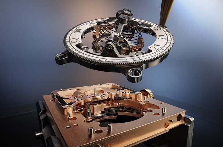 ▲第四代Gyrotourbillon以鈦金屬雙框架運轉,懸浮於雙面面盤間,展現精準與動態的機械美學。