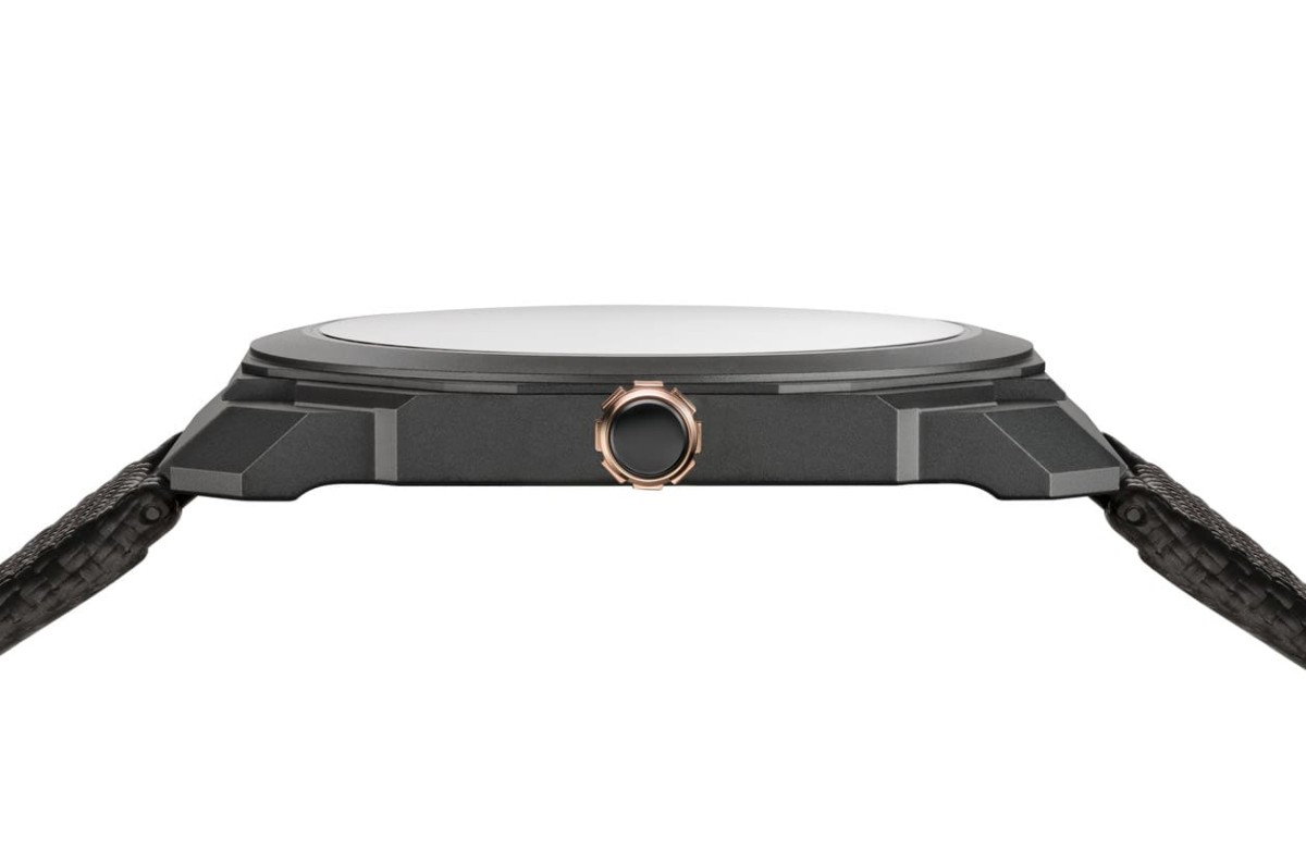 新作採用晤面黑色DLC塗層的五級鈦金屬錶殼,直徑40mm、厚度更僅5.95mm,延續系列一貫的輕盈與纖細,黑色有助於讓八角層次顯得更加內斂,同時散發一種宛如黑曜石雕刻般的沉穩氣場,尤其錶殼58個切面經噴砂處理後,表面細膩、觸感溫潤,透出寶格麗標誌性的義式優雅。
