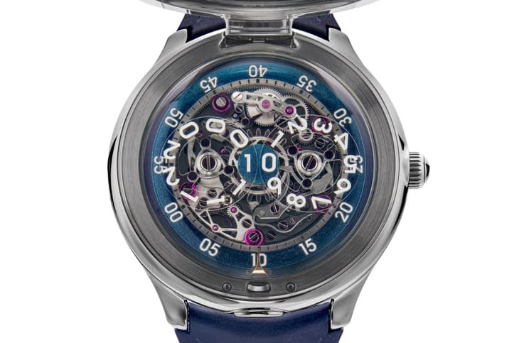 Time Jumper內部是新的24小時雙數位跳時機制,由兩片獨立藍寶石圓盤分別負責十位與個位數字,並以 Super-LumiNova塗覆增強夜視辨識度,選擇24小時制本身就帶有致敬意義,它呼應太空儀器在沒有日夜概念的環境中提供清晰時間讀數的需求,也讓手錶閱讀方式更具科技氛圍;分鐘顯示則透過一枚環繞面盤周邊旋轉的藍色圓盤呈現,經雷射上色並帶有細膩紋理,旋轉時帶出滑行的流動線條,視覺感受與外殼的流線感相互呼應。