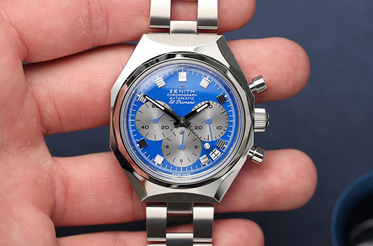 這只DEFY計時碼錶USM完全忠於1969年DEFY的殼型設計,真力時沒有刻意把它放大,也沒有硬塞現代跑格,而是選擇維持最經典、最緊湊的37mm尺寸,現代計時碼錶很少做這麼小,但也因此它在手腕上既有工業力量感,又不會太壓迫。八邊形中層錶殼、十四邊形錶圈,加上拉絲與拋光的交錯面處理,是原版DEFY最具代表性的特徵,完整被保留了下來,透過這些稜線和角度不同的反光表面,你能感受到當年被稱為「金庫」的堅固結構與前衛設計。比較值得玩味的是,1960年代末由傳奇鍊帶製造商Gay Frères為真力時打造的「梯形鍊帶」也隆重回歸,鍊帶中段鏤空的獨特結構,既減重、穿透感也更強,與錶殼的幾何線條有著完美呼應,與其說它是在「懷舊」,不如當成是把1969年那種敢於突破的建築感設計再次具象化。