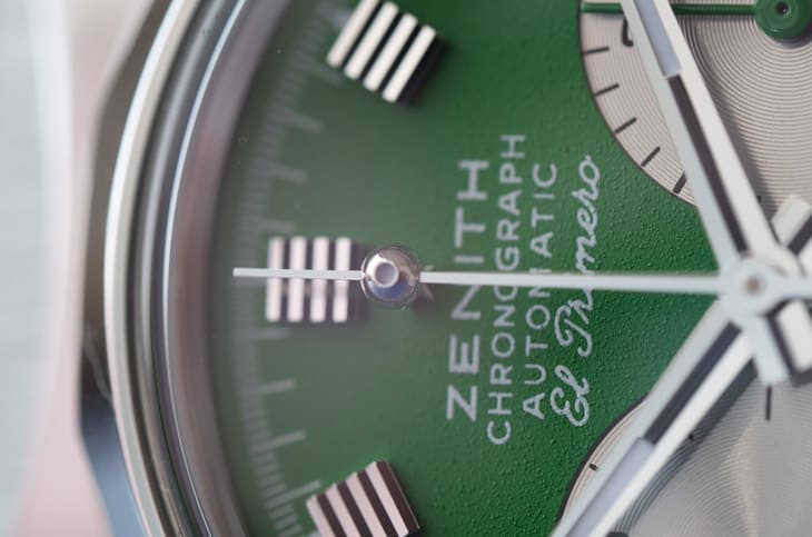 USM限量款面盤有四個版本:龍膽藍、金黃、純橘、USM綠,全部都和USM Haller家具系統的招牌色調完全一致。為了做到「完全一致」,真力時的面盤工藝師特別重新調配顏料,就是要把USM那種高飽和、帶金屬光澤的漆色效果如實呈現。面盤上的長方形時標帶有橫向凹紋,一看就能感受到USM的模組化美學DNA,三個銀色計時盤以Concentric azuré圓紋處理,放大看會發現它與USM家具把手的圓形金屬件有呼應,細節藏得很巧妙。最令人會心一笑的,是計時秒針針尖那顆「微型USM球體連接件」。這顆球是USM Haller系統的靈魂結構零件,也是它能自由組合、自由擴展的關鍵,真力時直接把這個設計挪到秒針上,還填入了Super-LumiNova,讓它在夜間也能呈現光亮,把工業設計邏輯融入製錶,相當到位的創意。