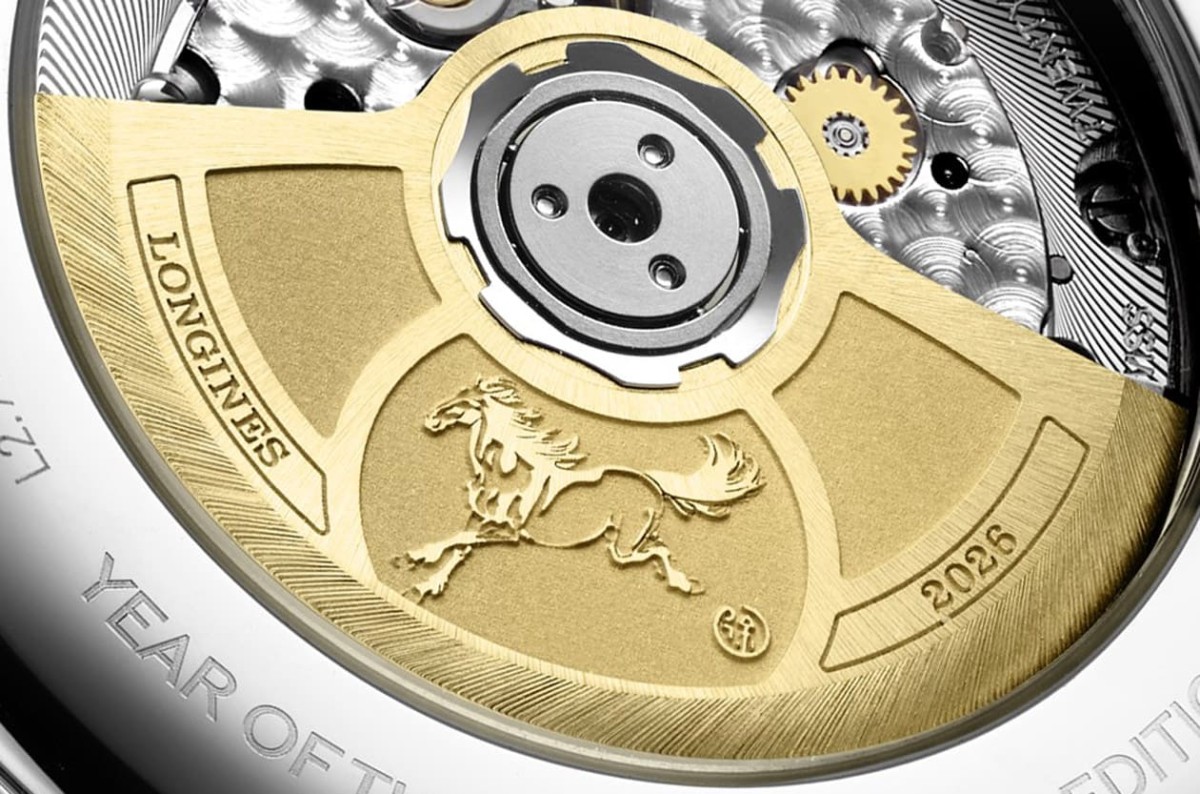 真正令人印象深刻的,則是翻至錶背後所展現的藝術層次,LONGINES此次與徐悲鴻美術館合作,將其經典《奔馬》畫作形象,轉化為機芯自動盤上的鍍金浮雕,當佩戴者手腕擺動,自動盤旋轉,駿馬彷彿在金色波紋中奔騰,將靜態藝術轉化為機械動態,形成極具意境的視覺體驗。自動盤上同時鐫刻徐悲鴻之子徐慶平親筆題寫的「奔馬得勢」與畫家落款,既是藝術傳承的象徵,也賦予腕錶強烈的祝福寓意,將文化、工藝與情感緊密結合。