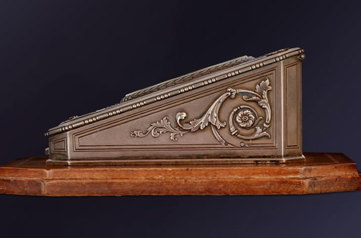 ▲銀金鐘殼的雕花精美,底座八角木質鑲嵌,展現奢華工藝與細膩雕刻。Source:Sotheby's
