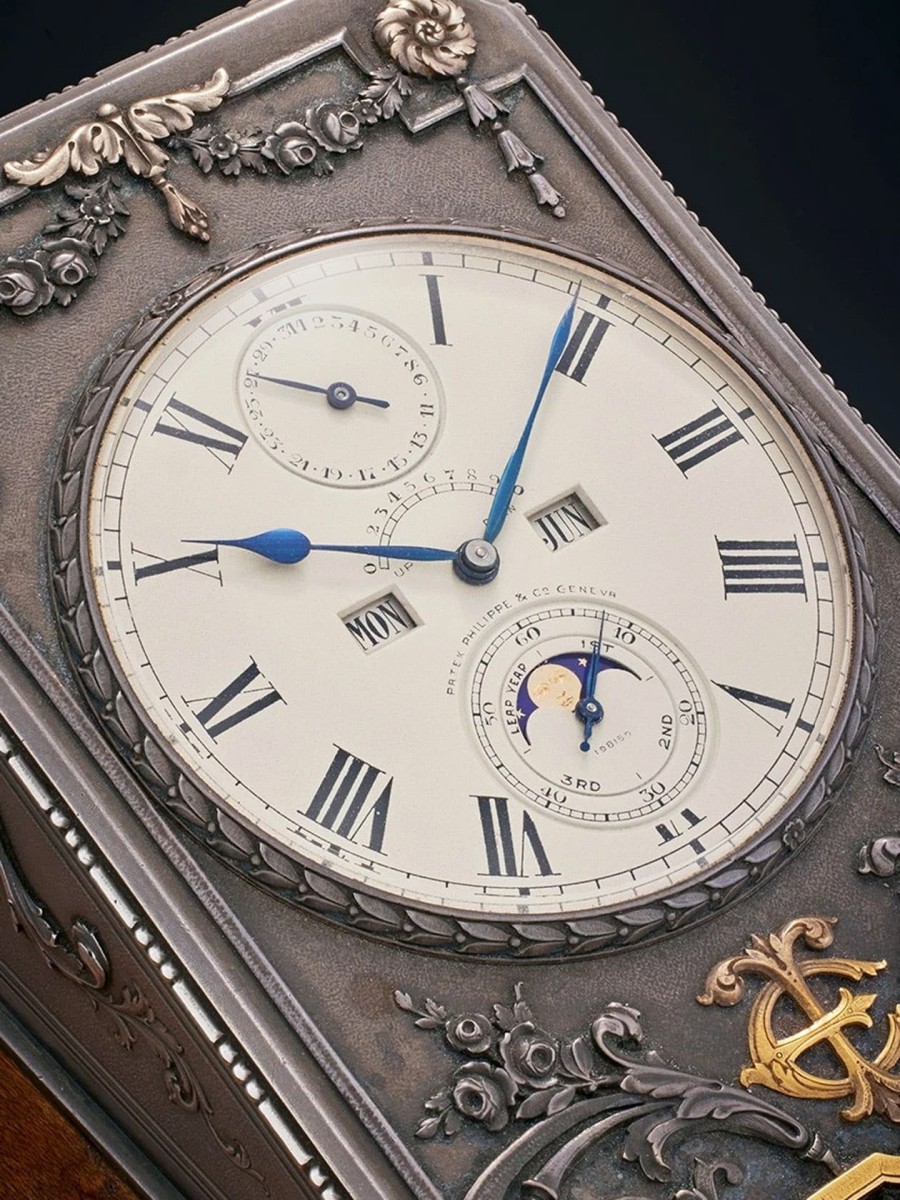 從機械與美學角度來看,「艾默里座鐘」無疑是非凡之作,它採用「紙鎮式」(Presse-Papier)設計,具備萬年曆、月相顯示和十日動力儲存功能,安置於雕刻精美的銀金錶殼上,刻有艾默里的個人姓名縮寫。Schnipper曾致電百達翡麗博物館館長Peter Friess博士確認,問到「Peter,你有聽說過第三座這種鐘嗎?」館長斬釘截鐵地回答:「絕對沒有。」