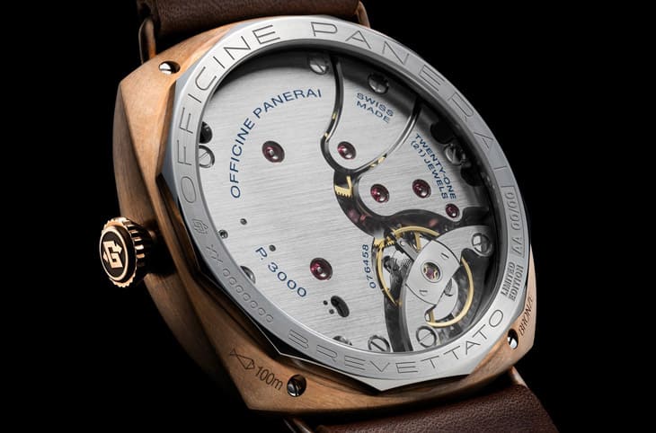機芯部分搭載手上鍊P.3000,擁有三日動力儲存,透過鈦金屬與藍寶石水晶組成的透明底蓋,可以看見類四分之三夾板結構,厚實而穩定,和青銅殼的粗獷氣質相當對味。
