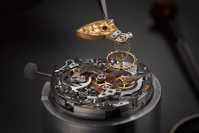 江詩丹頓重拾幾近失傳的Fleurisanne裝飾工藝,在機芯夾板上以陽刻方式雕除紋樣周圍的金屬,讓圖案浮出表面,此一裝飾工藝僅出現在週年紀念款,提升其收藏價值。