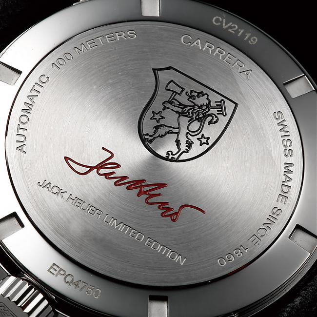 由於此次介紹的Carrera Calibre 17 Jack Heuer 80th Birthday非單純原版復刻錶作,更富有歡祝豪雅榮譽董事長Jack Heuer 80歲誕辰紀念的獨特意義,因此錶背實底蓋遂成了彰顯紀念主旨的絕佳舞台。底蓋上除可見到一些錶款的相關資訊如系列名、品牌創製年份、上鍊類型與防水深度外,更鐫刻有可追溯至15世紀的豪雅家族盾型徽飾、Jack Heuer親筆簽名字樣等,以及錶款僅發行3000只的限量標號,增添收藏吸引力。