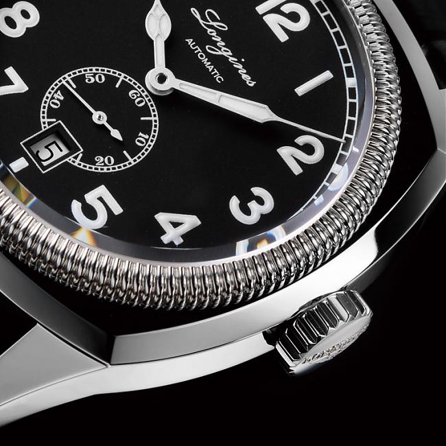 凹槽式錶圈和凹凸不平的錶冠是飛行手錶的特色之一,這種設計也可見於2013年推出的飛行手錶Avigation Oversize Crown手錶,方便戴上手套的飛行員輕易旋動錶圈以進行航空時間的計時;枕形的不鏽鋼錶殼則忠實呈現LONGINES於二○~三○年代,錶殼逐漸多元發展的面貌,直線與曲線交織的錶殼別具剛強柔和交融的美感,手錶錶面中央形成斜面設計,呈現微拱型的特色。
