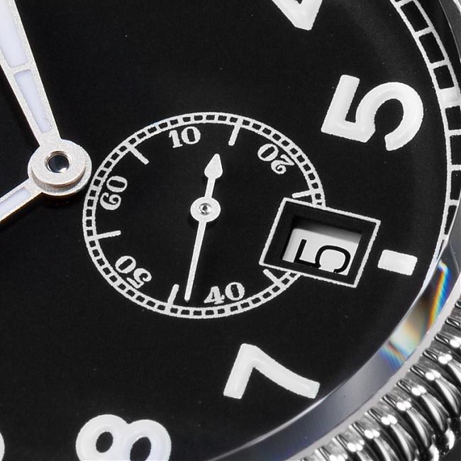從手錶的外形開始入手,不難發現其濃濃的軍事和飛行元素。立體的不鏽鋼枕形錶殼打磨亮麗,方形錶殼中設有扭索紋錶圈,凹槽式錶圈專為飛航員而設,是飛行手錶的一大經典特色,當初不少飛行手錶(包括這只的原型錶款)的錶圈都附有計時功能,扭索紋的設計方便戴上厚手套的飛航員操作。新款手錶移植了枕形錶殼和凹槽式錶圈,錶冠也設有凹凸的紋飾,與凹槽錶圈具有同樣的實用功能,忠實呈現手錶承載的飛行歷史。腕面盤面的設計大致上沿襲原型手錶,大型的白色時標配搭全黑面盤,指針、軌跡分鐘刻度圈和6點位置的小秒盤錶也飾以白色,清晰顯示時間,指針和數字時標更塗以Super-LumiNova®夜光塗層,進一步確保手錶的閱時可靠。