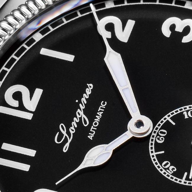 6點位置的小秒盤與原型錶款同樣以軌跡式刻度圈表示,呼應面盤外緣的分鐘軌跡刻度,擷取原款的設計元素同時不會顯得過時,顯出LONGINES歷經考驗的優雅;與舊款不同的是,小秒面盤的大小稍微變細,位置也稍稍向上移動,空出了時標"6"的位置作日期視窗之用。日期視窗的純白底色與霧黑色的面盤展現強烈對比,同時締造更清晰的閱讀,簡潔顏色的運用使手錶保留古典的樸實美感。