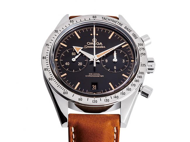 Speedmaster '57 所繼承的圓形計時按把,是自創製以來即備受玩家喜愛的一種樣式,彷彿計時碼錶使用起來就是需要這樣的觸感,在按壓的時候稍許沉嵌入錶側,再輕巧地彈開。此外,在錶冠鐫刻「OMEGA」 希臘字母,也是OMEGA 手錶的經典標誌,這個「OMEGA」 的造型,隨著時間演化也有所改變,早期的「OMEGA」 符號中央的空洞較窄,整體顯得較為修長,近代的「OMEGA」 才是現在常見更接近正圓的造型。