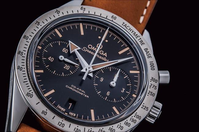 時標刻度的表現,則是另一項不同於'13年Speedmaster '57的細節,'15年新作在時標刻度的處理上,採用凹陷方式處理,也在時標內運用與指針相同的Super-LumiNova 超螢光塗料進行內填、與現代夜光技術相對較為復古。這些懷舊的小細節,與現代超霸在9300同軸擒縱機芯主導下構築出的雙眼佈局結合,再搭配新添的日期顯示功能,共同為錶款交織出具有先進技術能量的復古