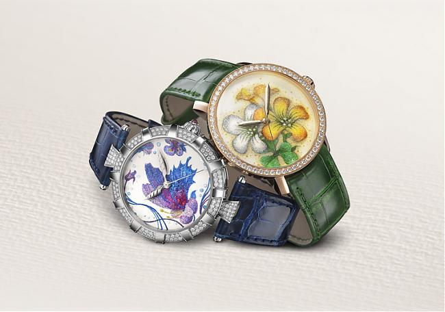 經典系列珠寶手錶配備18K玫瑰金錶殼,鑲嵌一行鑽石,點綴黃色、橙色和綠色等充滿春天氣息的色調。由鑽石、珍珠、鉑金、金、虎眼石、孔雀石、石英及其它寶石粉末合成的顏料令花卉圖案流光溢彩。手錶配備鮮綠色鱷魚皮錶帶。DEWITT全新女士珠寶手錶系列融合悠久的瑞士製錶傳統和傳承千年的日本書法藝術,可謂均衡和諧,充滿詩意的精純之作。