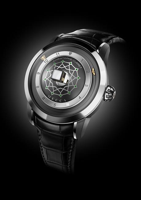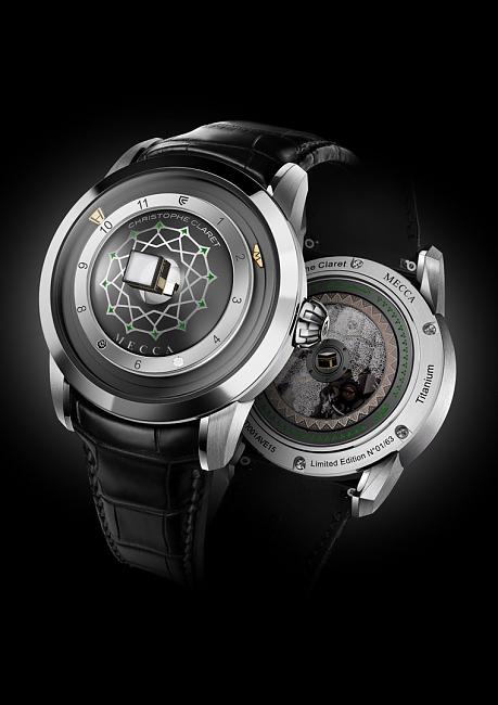 承繼先前Aventicum羅馬皇帝手錶的特殊技術,CHRISTOPHE CLARET再推出Mecca手錶,並以三維全息裝置的特別光學現象呈現各種穆斯林信仰的象徵。手錶中央有天房微雕,透過三維全息裝置投射出放大近兩倍的映像。除天房微雕外,Mecca手錶包含多項象徵穆斯林信仰的設計,5時刻度及7時刻度分別以白色陶瓷石及黑色尖晶石取代,象徵黑石及繞行。擺輪畫有白點及世界地圖,象徵穆斯林向天房朝覲。12時、4時及8時分別有對穆斯林別具意義的阿拉伯文字句。連圓周63毫米的錶殼亦象徵穆罕默德離世時的歲數。種種設計均衷心向穆斯林信仰致敬。