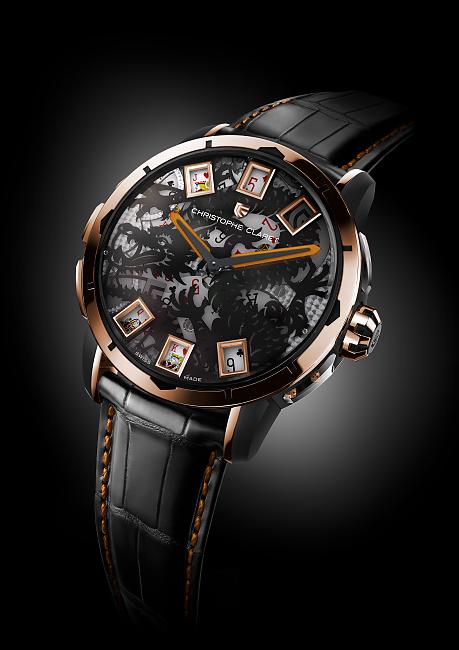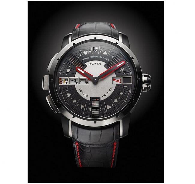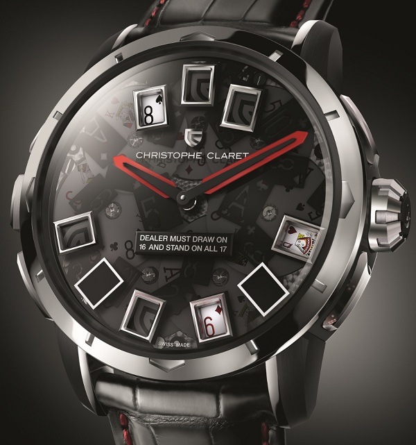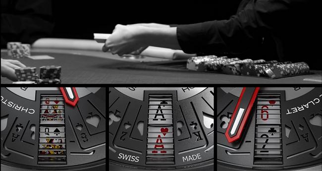 目前博弈錶最出名的品牌之一就是CHRISTOPHE CLARET這個獨立製錶品牌(注意!之後還會出現很多次!),21 Blackjack是從真正的撲克牌遊戲21點所製作出的博弈錶,面盤上有9個視窗,每個視窗都可顯示面盤下的撲克牌盤,面盤上方的3個窗格顯示莊家所持紙牌,下方的6個窗格為玩家手上的牌,按下9點鐘按把就可同時推動9個窗格下的紙牌盤轉動,包括莊家與玩家總共可隨機顯示884,736種勝負結果,開牌時還會自鳴一次,絕對不能作弊的啦!
