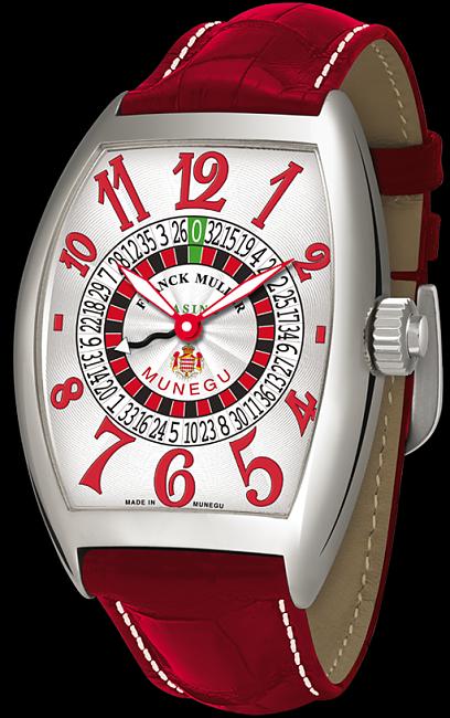 FRANCK MULLER的Vegas是滿早期的作品了,不過上面的創意還是非常厲害。面盤上是俄羅斯輪盤的造型,除了時、分指針之外,還有一根針用來指示輪盤數字,按下錶冠上的按把,這根針就會快速旋轉(是真的轉得滿快的!),再按一下就會停止。