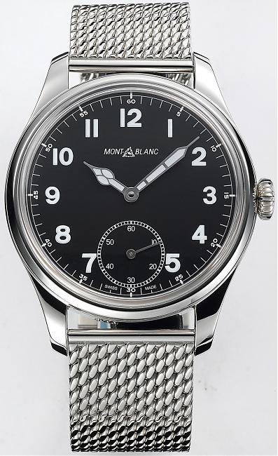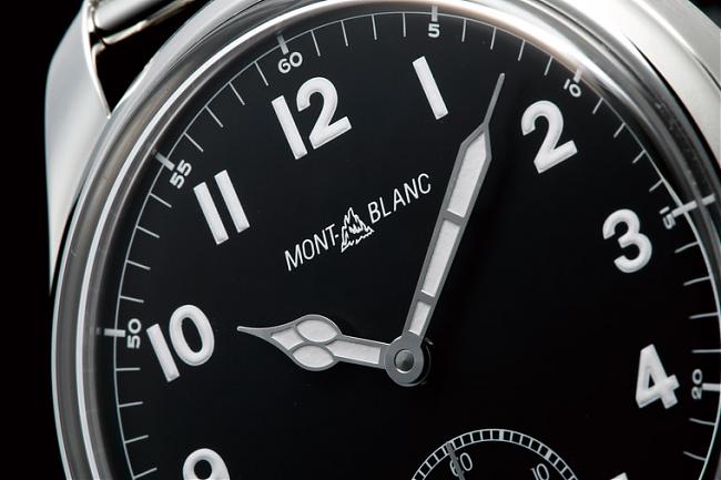 錶款採用了相當標準的復古飛行軍錶的樣式,包括了教堂式指針、阿拉伯數字時標和軌道式小秒鐘刻度等等;此一設計雖然簡單卻仍然看得出用心之處,像是最外圈的5分鐘數字字體的選擇就十分道地,這點觀察其中的2、3、6等等幾個的筆畫最有感覺。整個面盤上最值得一提的自然要數萬寶龍的舊版Logo,這個Logo是品牌早期所使用的,算是近代首次出現在腕錶產品上;老實說像這種本格派的飛行軍錶市場上的選擇多如牛毛,要堅持正統設計又要做出吸引人的區隔並不容易,然而這個復古Logo在這裡卻稱職地達成了這個任務,為錶款創造了獨一無二的價值,算是相當聰明的一招。