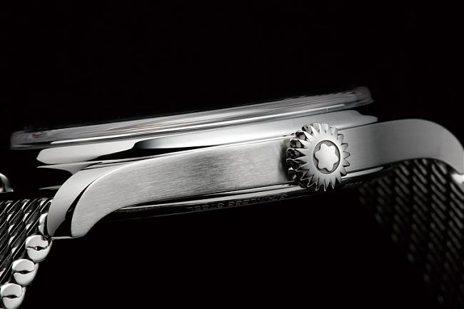 錶冠算是洋蔥形的樣式,不過較為扁平,末端的萬寶龍六芒星Logo是個頗為討喜的細節。錶鏡是Box是的凸面藍寶石水晶,對比窄版的錶圈顯得更為突出,錶鏡的固定技術應該也不簡單。