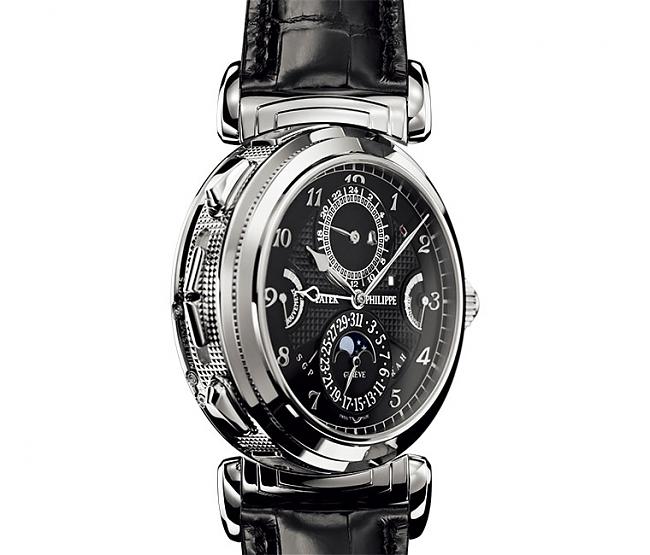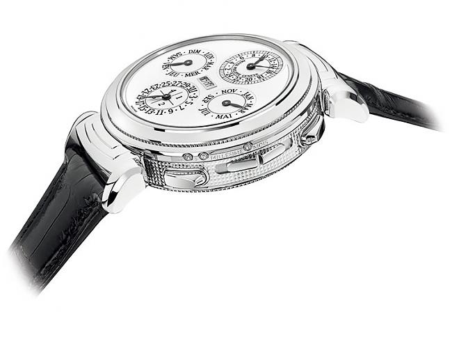 6300G採用白金材質外殼,錶圈與錶耳等處俐落地施以拋光處理呈現與5175R那股華麗繁複風格鮮明的對比,不過在錶側部分還是可以見到整齊中略帶立體感的巴黎釘紋增益錶款的視覺效果。6300G的雙面設計格局與5175R如出一轍,唯獨在面盤色調上,6300G擁有中央時分指針的面盤改為黑色(面盤內圈則呼應錶側以巴黎釘紋加以點綴),而另一面的萬年曆面盤則仍為白色,如此更能輕易辨別雙面的功能屬性,是增益佩戴者辨時直覺性的細節變革。