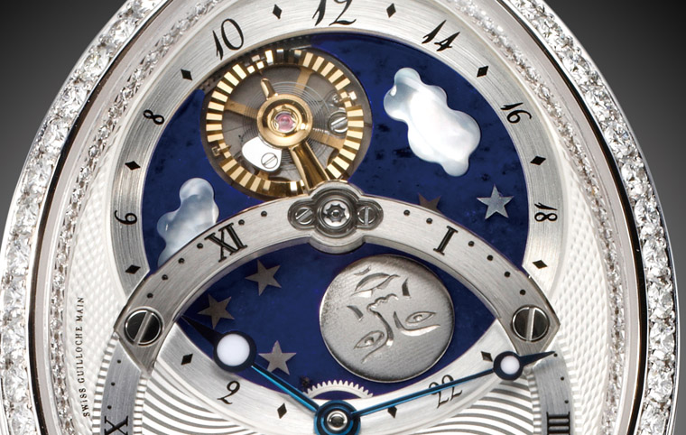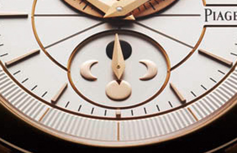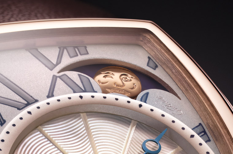 寶璣將傘型月相視窗設於1~2點方向,此外其圓形月亮零件上更可見刻畫出擬人的生動表情。