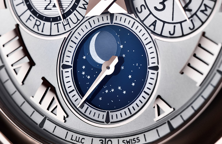 蕭邦利用盤面層次掩映而在藍色星空盤上循序呈現月相盈虧狀態,帶來無遮蔽的視覺美感。