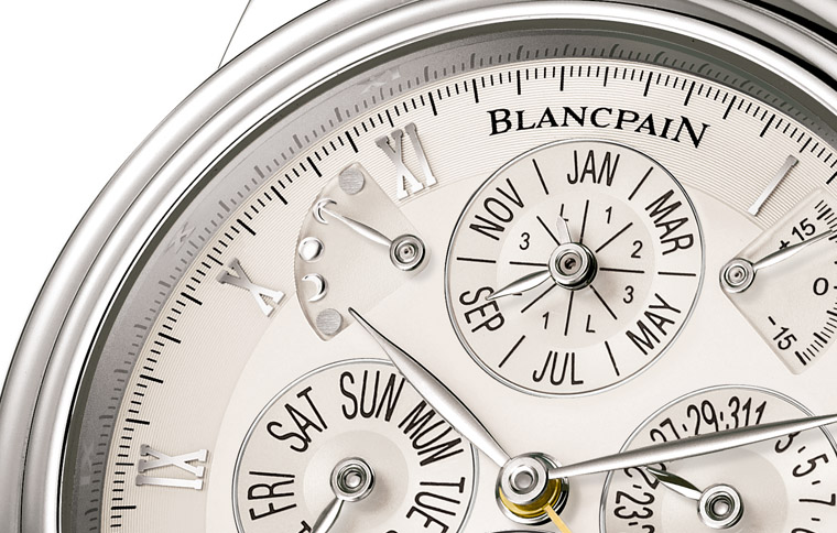 寶珀曾推出的時間等式萬年曆腕錶在10~11點方設置逆跳月相以與天文時差錶盤左右對稱。