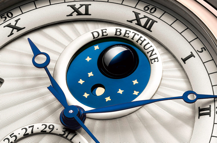 De Bethune採用的球體月相為品牌一大特色,其於月相機制中改採月相球零件,使月相立體感十足。