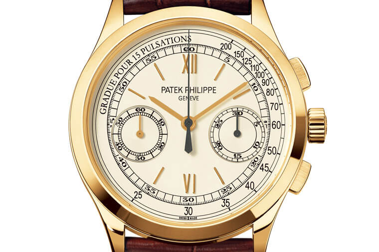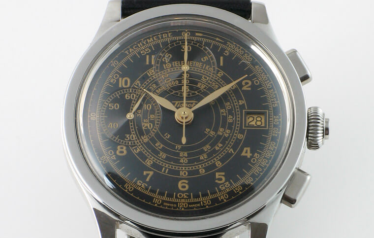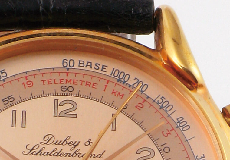 計時功能還有一種較專業化的附加設計——針對醫護人員或運動員需要而生的脈搏測量功能。在面盤看到"Pulsations" 這個關鍵字即表示該錶款的計時功能具有測量每分鐘脈搏跳動次數的作用,通常完整的呈現字樣為Gradue Pour(Basedon)15 Pulsations,其中數字代表測量基數,以上述為例即按下計時按把後,佩戴者開始計算脈搏次數,達到15 次時按停,若停在8 秒位置再對應尺規便能得出測量對象每分鐘脈搏跳動約為110 次;當然不同錶款的測量基數亦不盡相同,因此尺規上的刻度會隨基數調整。