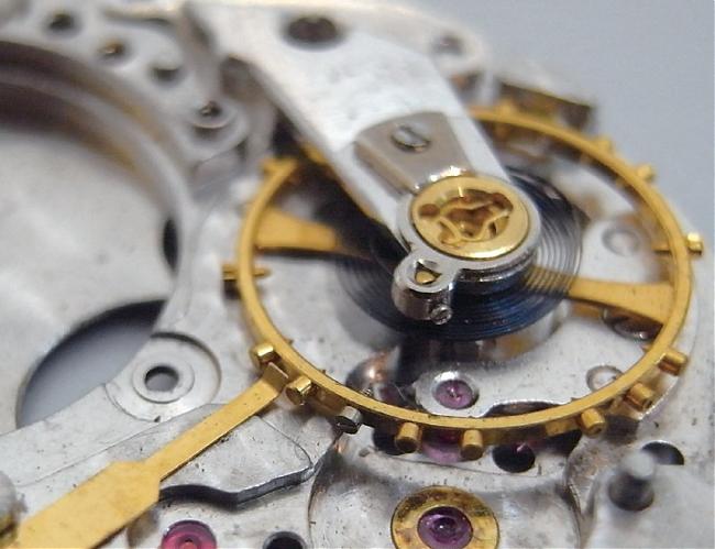 圖中可見擺輪之所以停止運作,是因為有一個尾端略微上翹的掣停簧片伸至擺輪暫阻其運作。